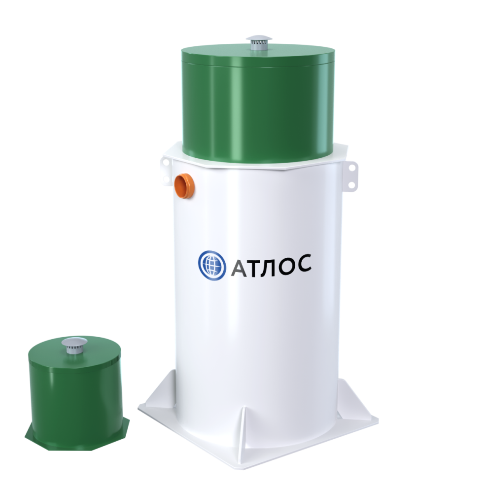 Базово Атлос 4 имеет комбинированное водоотведение. Насос для принудительного отвода в комплект не входит и покупается отдельно, но площадка под него уже предусмотрена. Компрессор вынесен из корпуса, что для сервисного доступа является плюсом. По монтажу модель подходит для высокого УГВ с оговорками: высота корпуса 1850 мм уже требует внимательной оценки участка, особенно если дополнительно нужны доборы. Глубина входа составляет 510 мм в базе и до 1410 мм максимально. Аварийная сигнализация уровня доступна как опция, дополнительных решений по обеззараживанию нет. Обслуживание — простое.