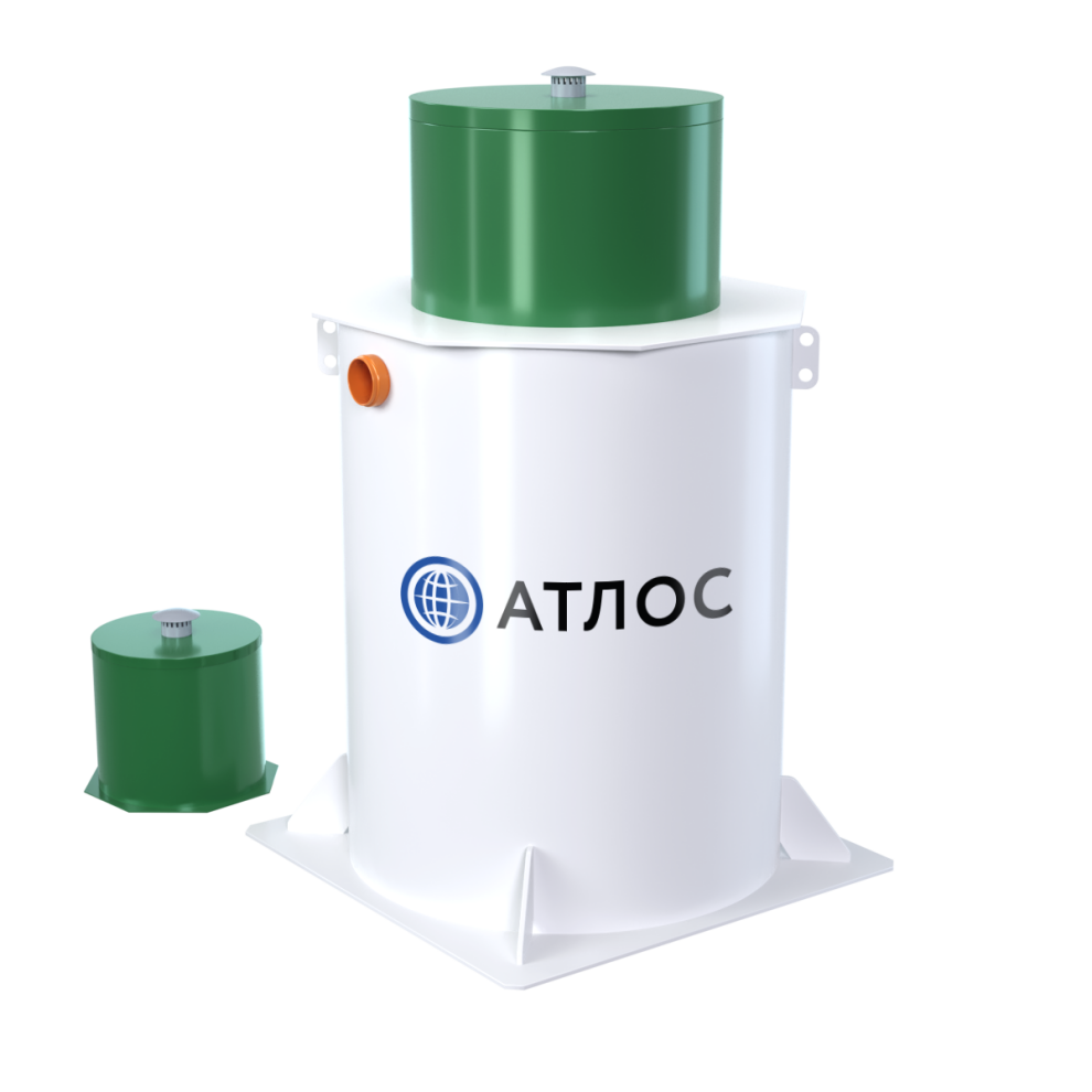 Базово Атлос 8 имеет комбинированное водоотведение. Насос для принудительного отвода в комплект не входит и приобретается отдельно, при этом площадка под него есть уже в базе. Компрессор вынесен из корпуса. По монтажу модель подходит для высокого УГВ с оговорками: высота 1850 мм и возможные доборы требуют учитывать итоговую высоту станции на участке. Базовая глубина входа — 510 мм, максимальная — 1410 мм. Аварийная сигнализация уровня доступна как опция, дополнительных решений по обеззараживанию нет. Обслуживание — простое.