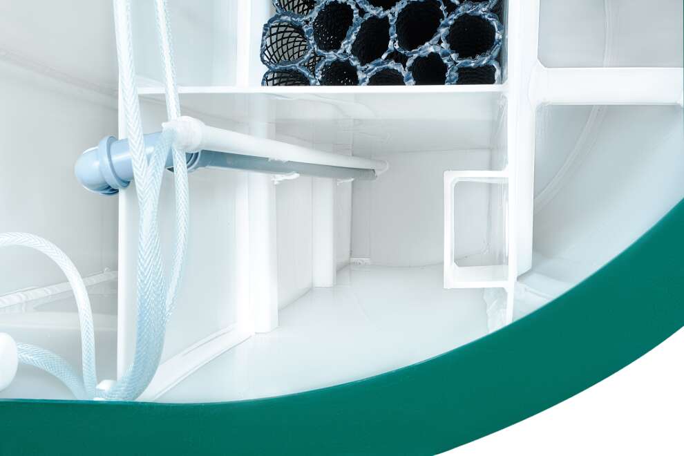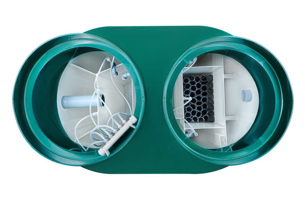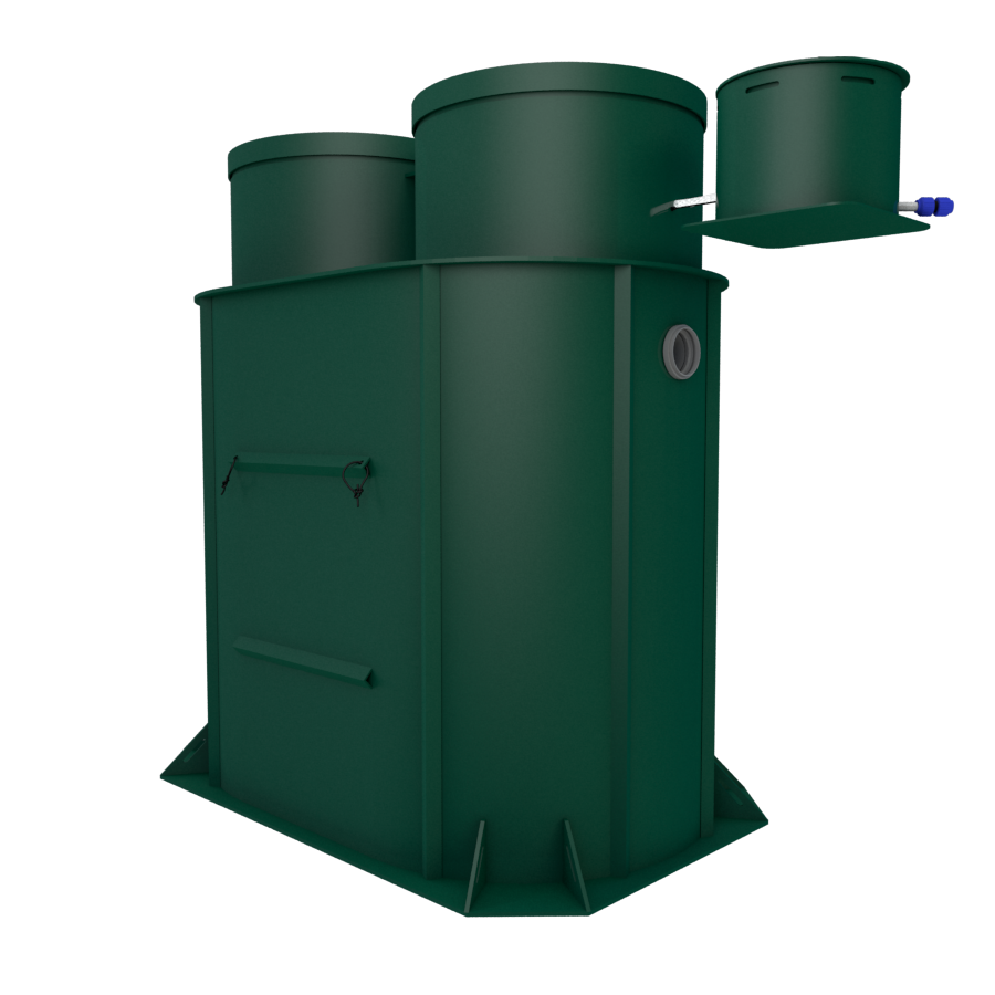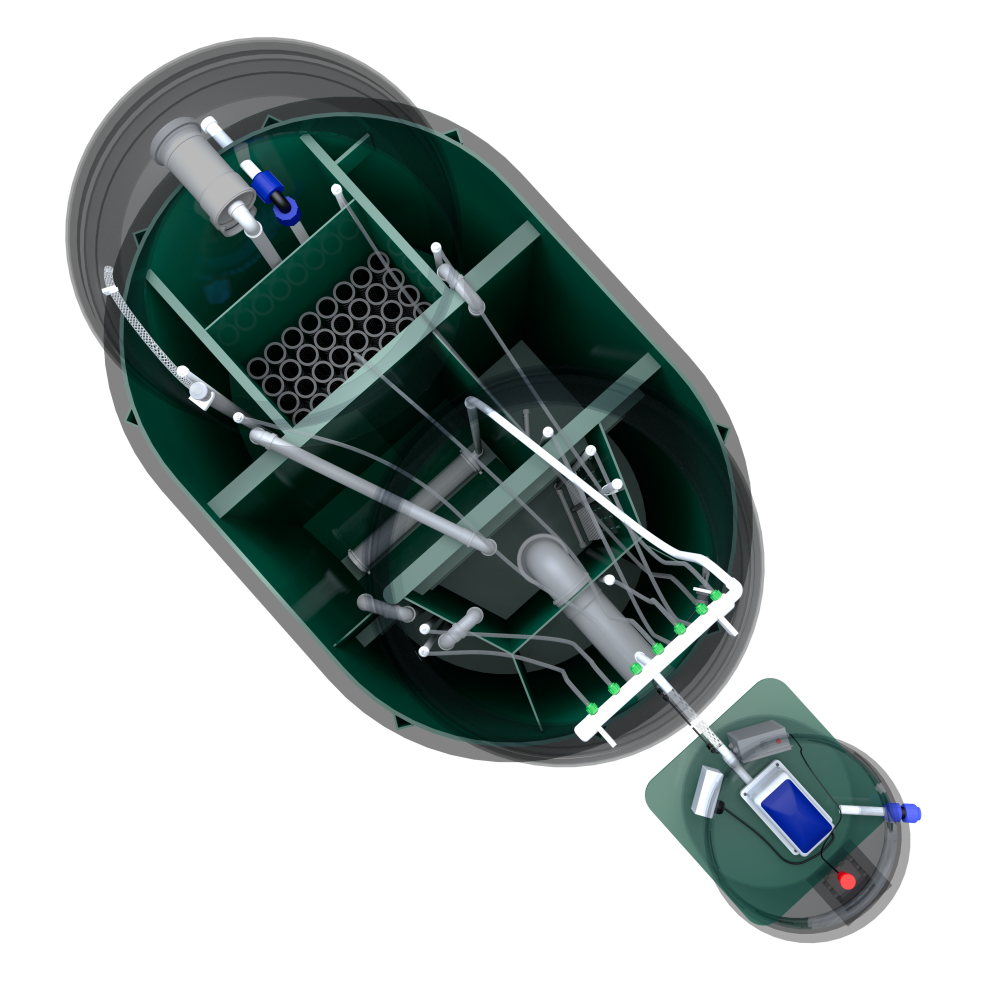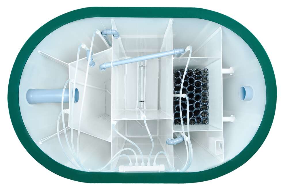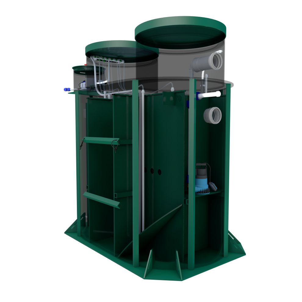 В конструкции задействованы крупнопузырчатые мешалки в аноксидных камерах, мелкопузырчатый аэратор в аэробном биореакторе и отдельная аноксидная биозона. Биозагрузки здесь много: FBC-structured используется и в аэробном, и в аноксидном биореакторе. Именно поэтому станция выгодно отличается высокой устойчивостью к бытовой химии по меркам бытовых СБО. Базовое водоотведение — комбинированное, площадка под насос предусмотрена, но сам насос для принудительного сброса покупается отдельно. При высоте корпуса 1399 мм модель подходит для монтажа при высоком УГВ, что делает её особенно интересной для сложных участков. Компрессор вынесен из корпуса, доступны доборы 100, 250 и 500 мм, а также опции аварийной сигнализации и хлорного обеззараживания. Обслуживание у станции сложное, но сама конструкция рассчитана на серьёзный и стабильный режим работы.