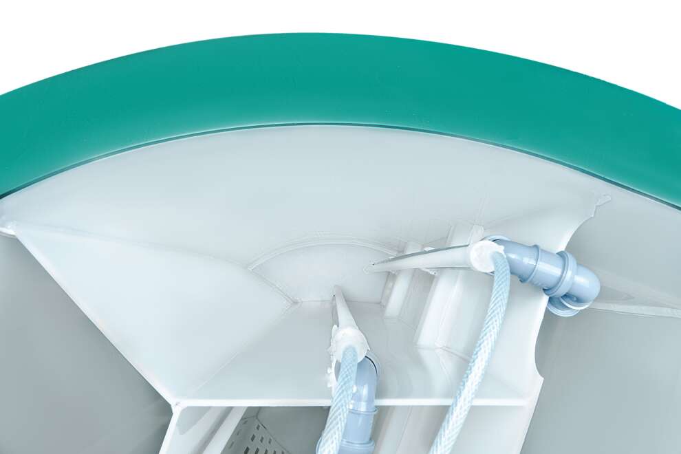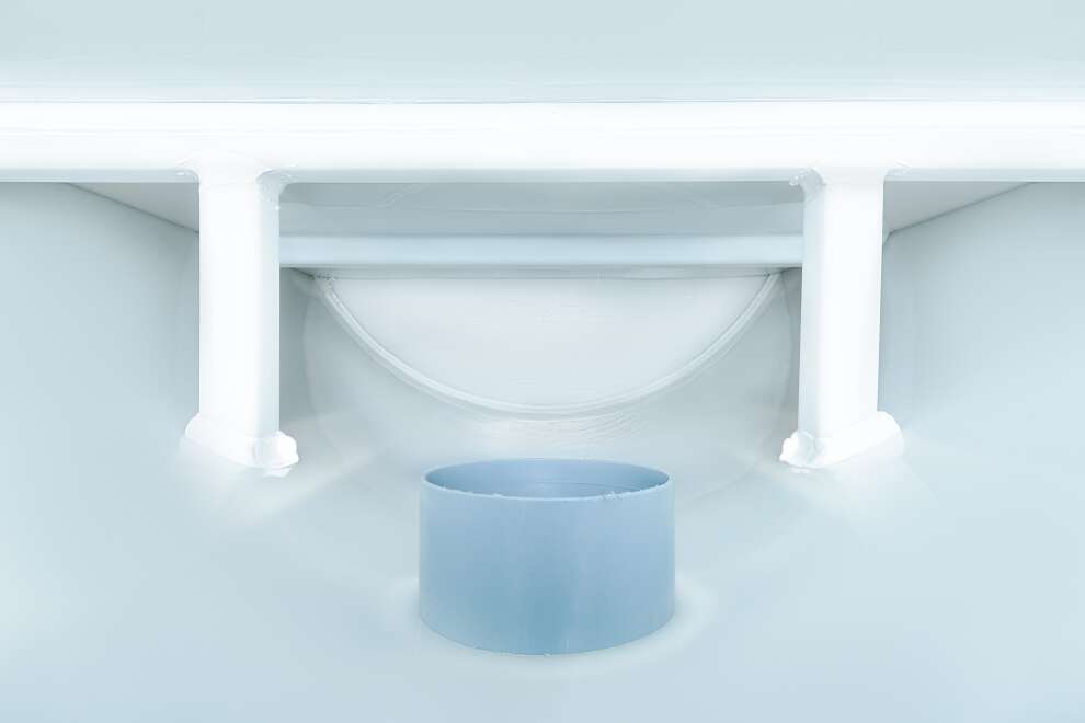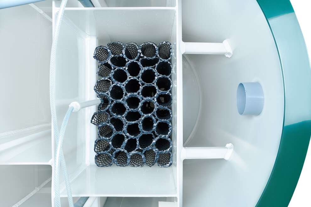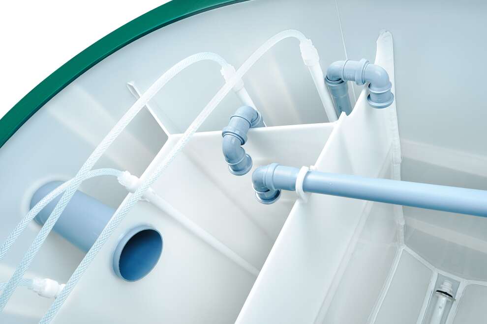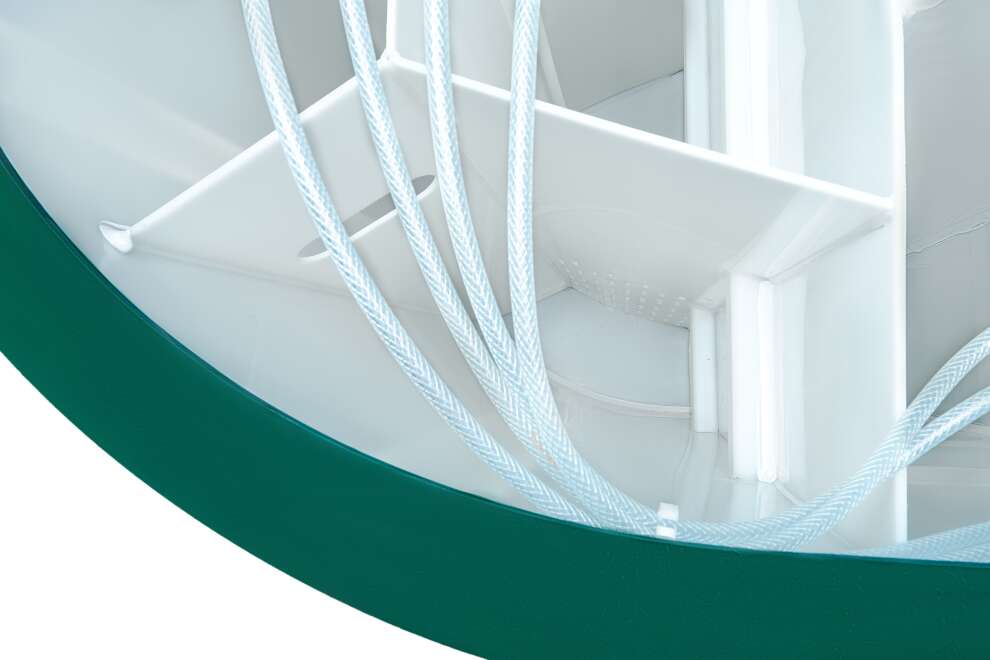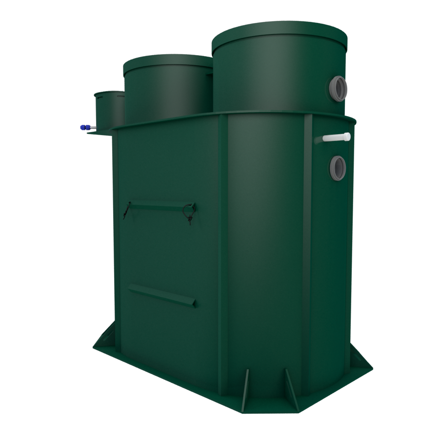 В конструкции задействованы крупнопузырчатые мешалки в аноксидных камерах, мелкопузырчатый аэратор в аэробном биореакторе и отдельная аноксидная биозона. Биозагрузки здесь много: FBC-structured используется и в аэробном, и в аноксидном биореакторе. Именно поэтому станция выгодно отличается высокой устойчивостью к бытовой химии по меркам бытовых СБО. Базовое водоотведение — комбинированное, площадка под насос предусмотрена, но сам насос для принудительного сброса покупается отдельно. При высоте корпуса 1399 мм модель подходит для монтажа при высоком УГВ, что делает её особенно интересной для сложных участков. Компрессор вынесен из корпуса, доступны доборы 100, 250 и 500 мм, а также опции аварийной сигнализации и хлорного обеззараживания. Обслуживание у станции сложное, но сама конструкция рассчитана на серьёзный и стабильный режим работы.