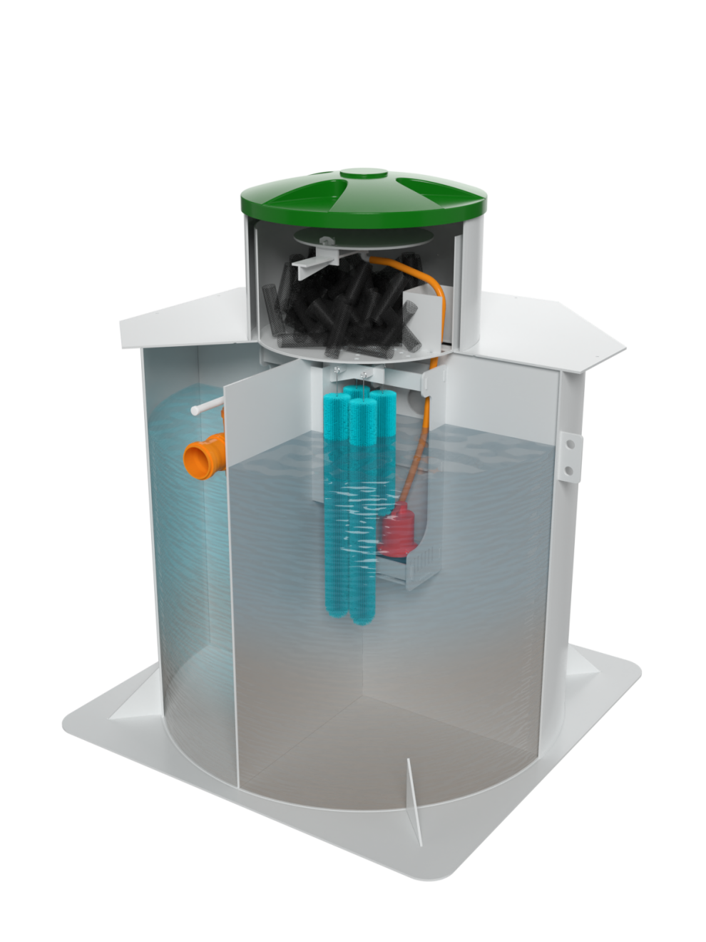 Базово Далос 10 имеет комбинированное водоотведение. Насос для принудительного отвода в комплект не входит и приобретается отдельно, при этом площадка под него предусмотрена конструкцией. По монтажу модель может использоваться на участках с высоким УГВ, но требует нормальной оценки общей схемы установки, а не только самой станции. Обслуживание остаётся простым, что делает модель понятной по сервису даже при её более высоком классе нагрузки.
