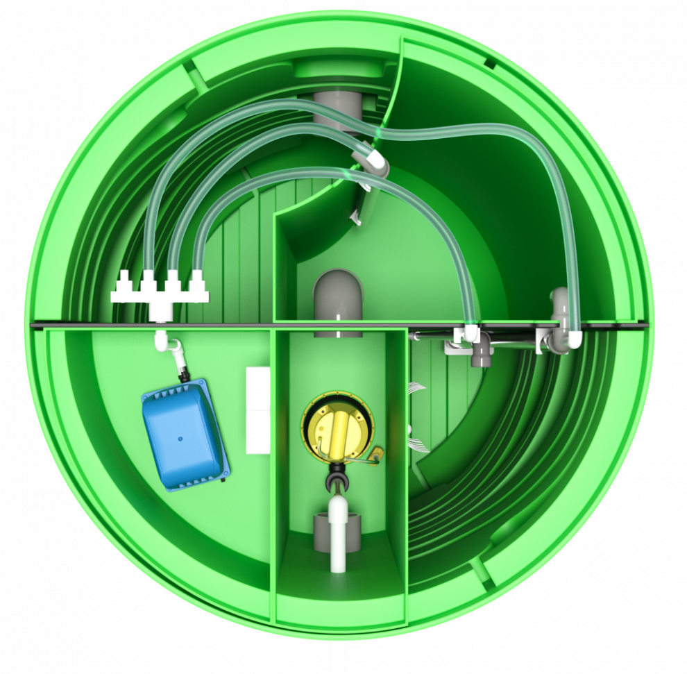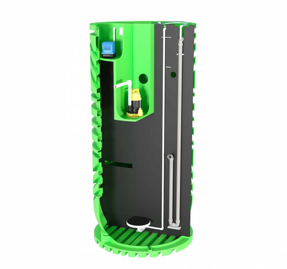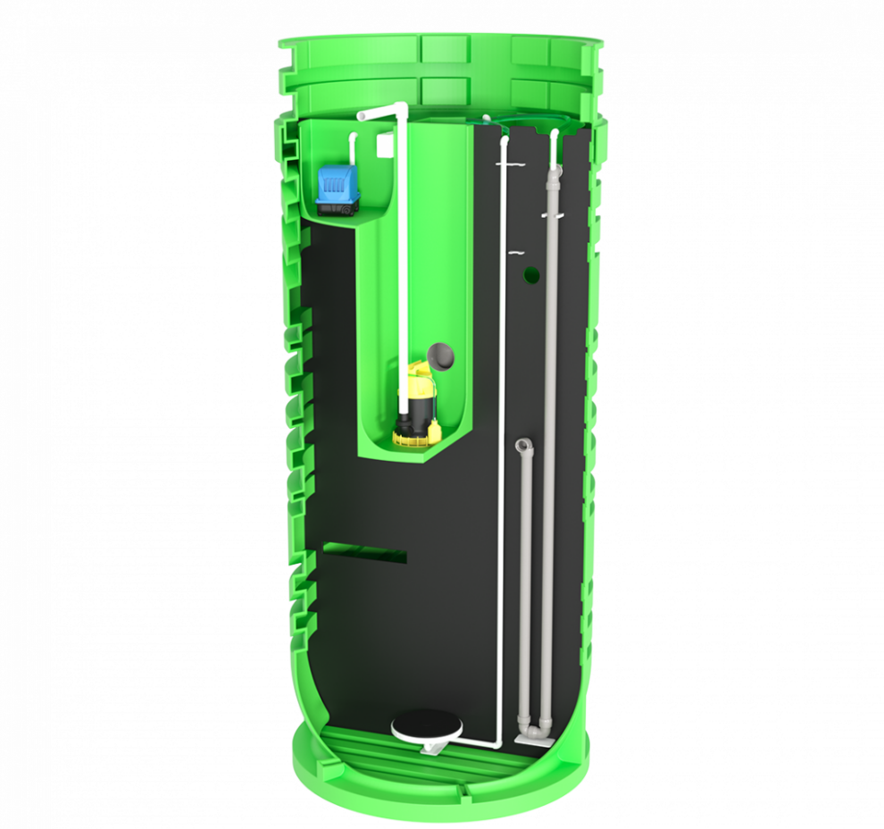 Базово Пеликан 5 имеет комбинированное водоотведение. Насос для принудительного отвода приобретается отдельно, площадка под него предусмотрена конструкцией. Корпус станции выполнен из полиэтилена, и по этой причине модель не считается подходящей для высокого УГВ: в сложных водонасыщенных условиях её монтаж требует дополнительных решений, которые делают такой выбор менее рациональным. Базовая глубина входа — 600 мм, максимальная — 1155 мм. Компрессор установлен внутри корпуса. Аварийная сигнализация уровня доступна как опция, дополнительных вариантов обеззараживания нет. Обслуживание — простое.