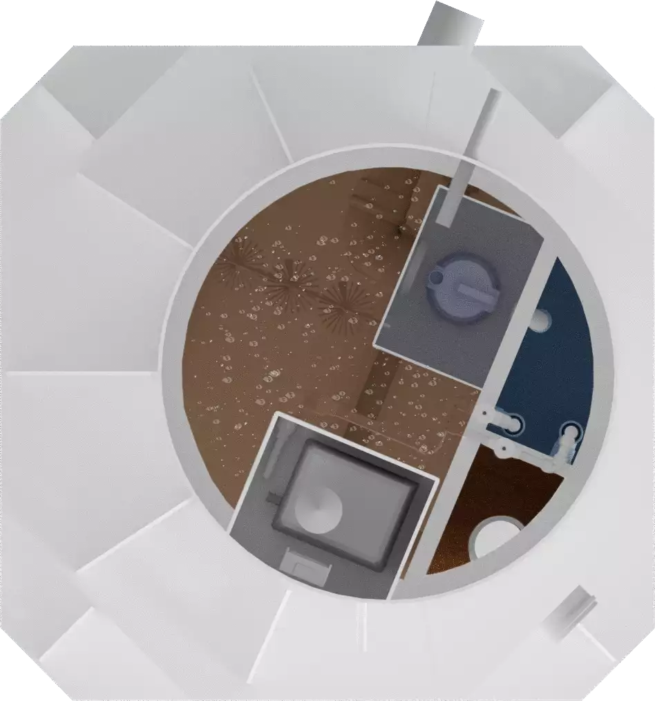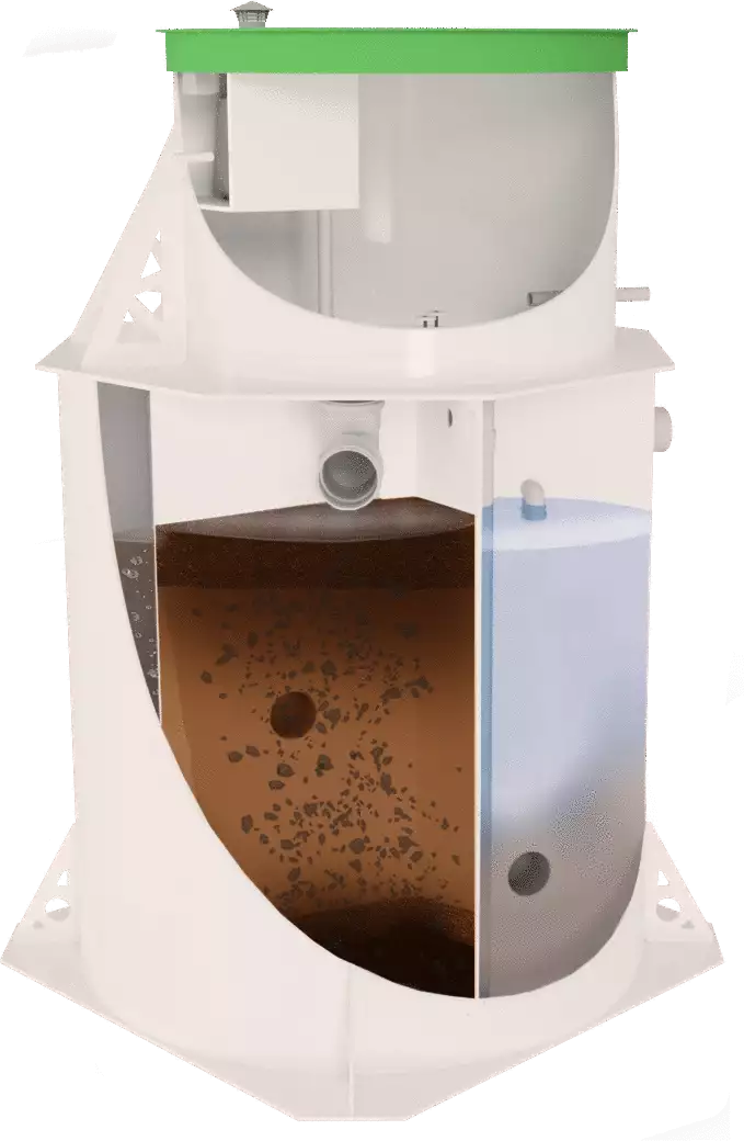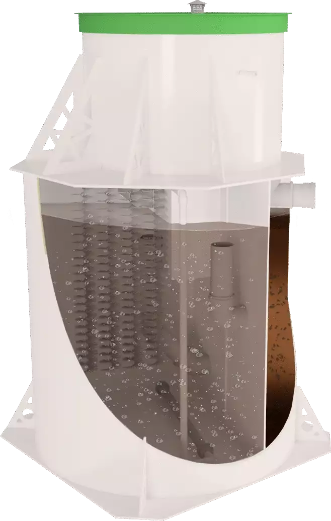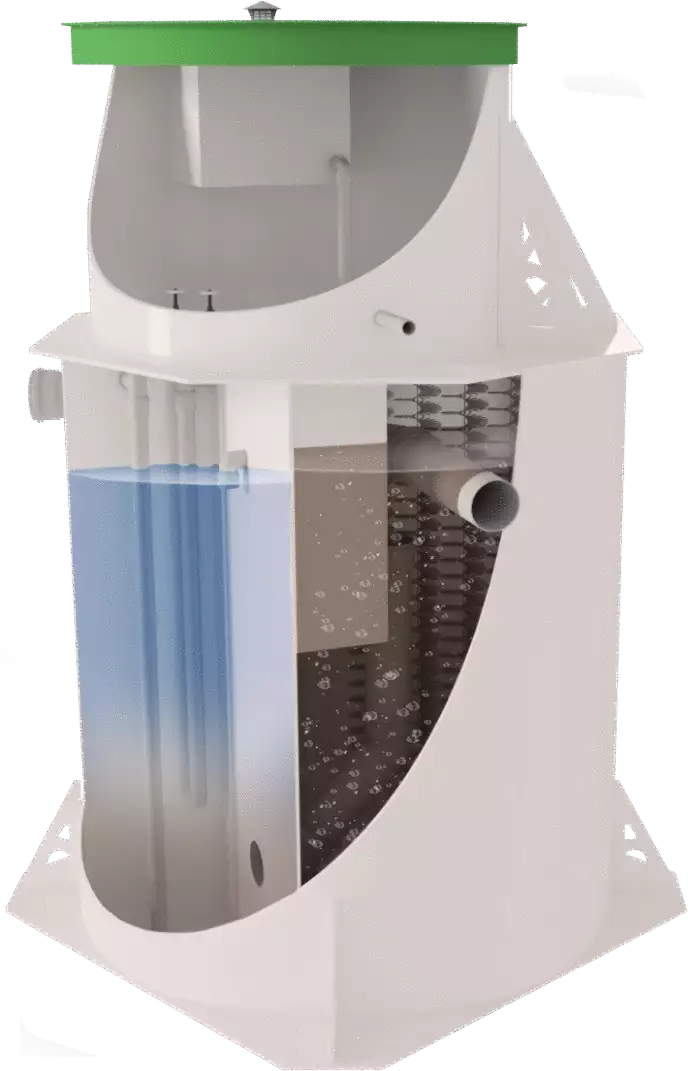 По внутренней логике Тверь PRO 0,8Н сохраняет общую концепцию серии: септическая часть работает вместе с компрессорной доочисткой, а биозагрузки в станции много. Это делает модель технологичнее и рабочеустойчивее, чем многие упрощённые решения близкого класса, но не превращает её в универсальную станцию “под всё подряд”. Устойчивость к бытовой химии у неё низкая, поэтому для дома с постоянным использованием агрессивных чистящих средств такой вариант стоит оценивать осторожно. К длительным простоям модель также чувствительна: режим “выходного дня” для неё неблагоприятен. Базово станция имеет комбинированное водоотведение, насос для принудительного отвода в комплект не входит и подбирается отдельно. Компрессор установлен внутри корпуса. При высоте 2070 мм модель подходит для высокого УГВ только с оговорками. Базовая глубина входа — 793 мм, максимальная — 1293 мм, что даёт хороший запас по подключению при глубоком выводе трубы из дома. Для станции доступны УФ-обеззараживание и аварийная сигнализация уровня как опция. Обслуживание — средней сложности.