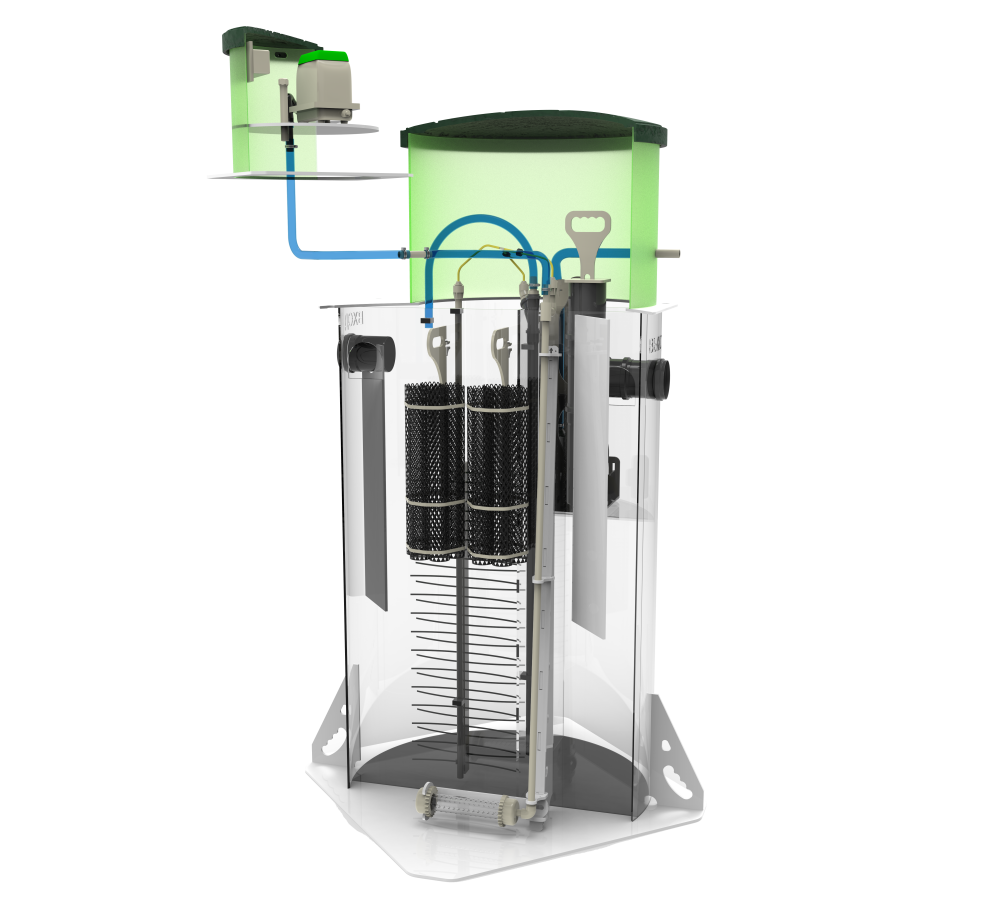 По конструкции модель сохраняет общую логику линейки: септическая часть сочетается с компрессорной доочисткой, очистка проходит через аноксидную, аэробную и анаэробную зоны с рециркуляцией. В приёмной камере установлена крупнопузырчатая мешалка, в аэробном биореакторе — мелкопузырчатый аэратор и FBC-structured загрузка. Объём биозагрузки — средний, но устойчивость к бытовой химии остаётся низкой, поэтому станцию стоит использовать в спокойном бытовом режиме без постоянной перегрузки агрессивными средствами. Устойчивость к простоям также низкая.