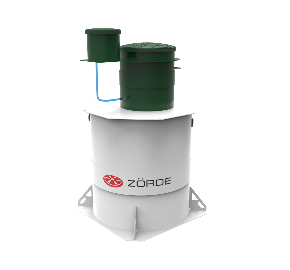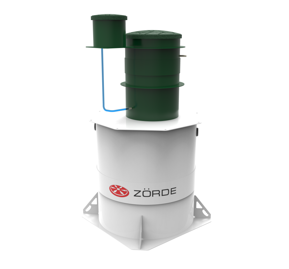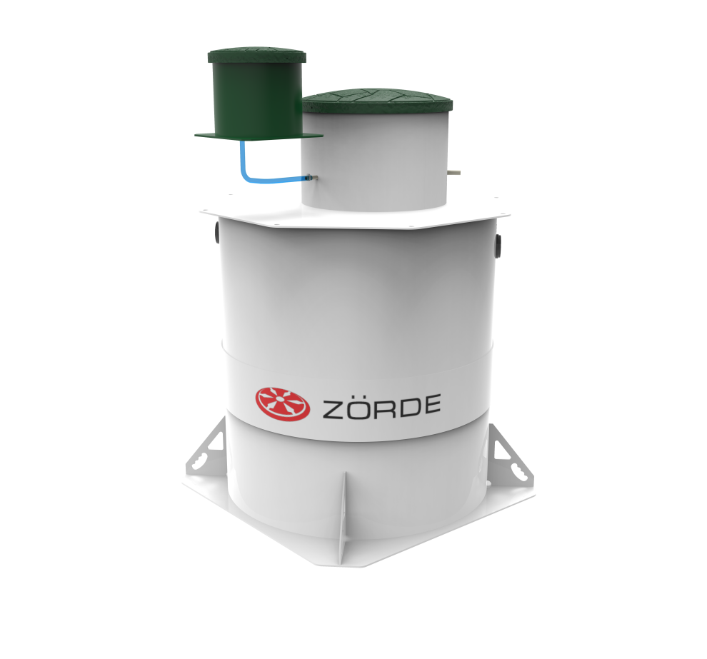 Базово Zörde Rein 8 имеет комбинированное водоотведение. Насос для принудительного отвода в комплект не входит и приобретается отдельно, при этом площадка под него уже есть. При высоте корпуса 2081 мм станция подходит для высокого УГВ только с оговорками. Базовая глубина входа — 600 мм, максимальная — 1200 мм. Компрессор вынесен из корпуса, аварийная сигнализация уровня предусмотрена как опция, дополнительных решений по обеззараживанию нет. Обслуживание — средней сложности.